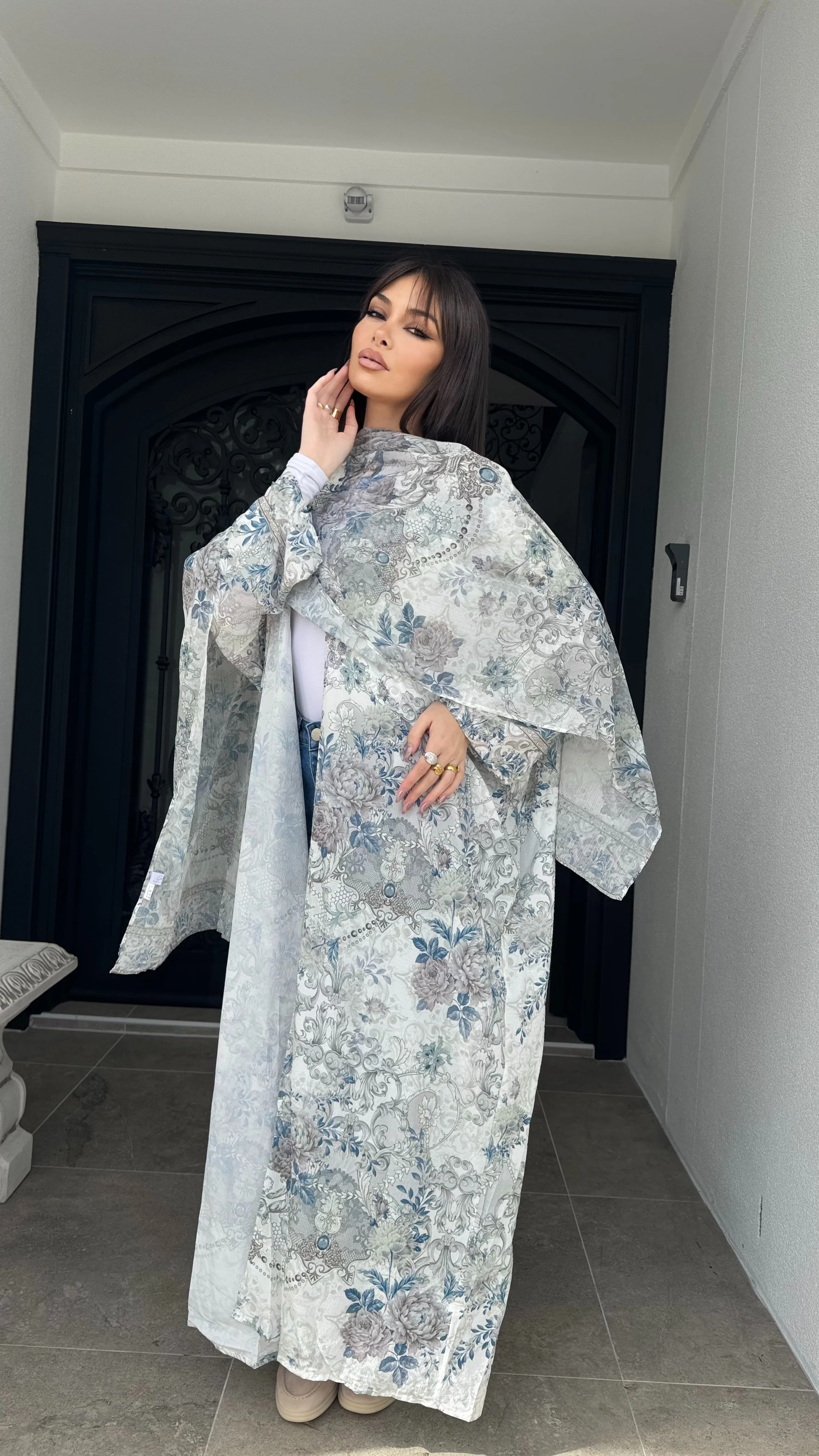 Stunning blue rose printed scarf with embellishment detail.Â